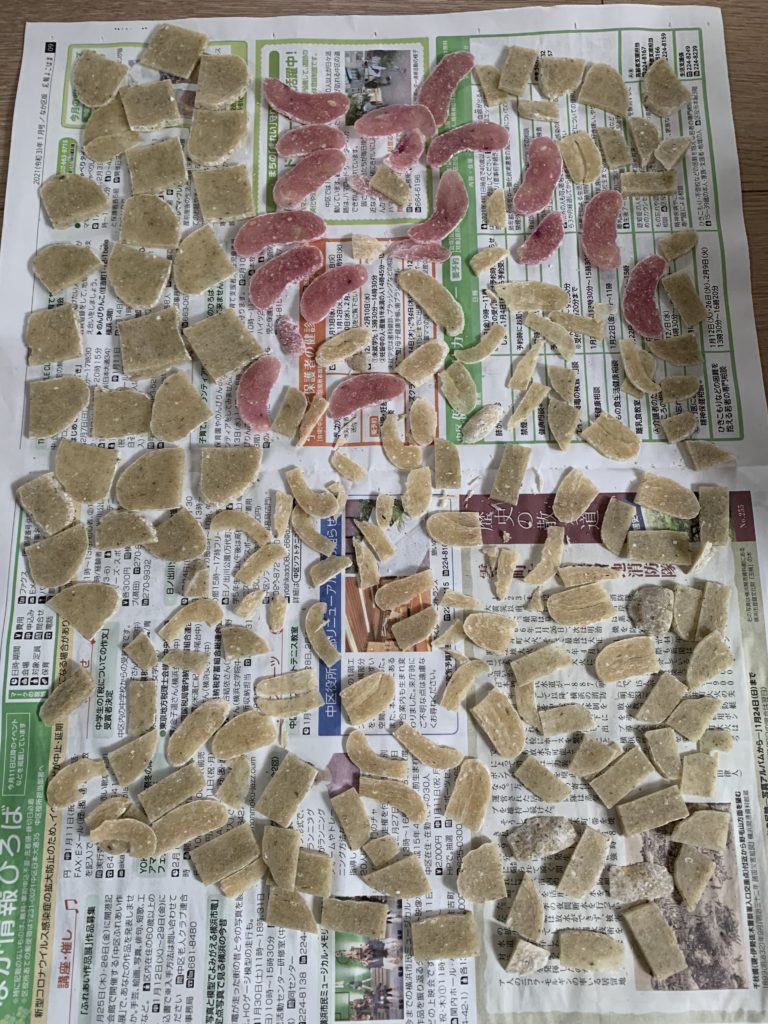 ミロク餅からかき餅へ キッズ農園 2021.01.04 (月) すっかり写真を撮るのを忘れ、カビが生える前に早めにお下げして、かき餅用にスライス、乾燥中〜 ツルムラサキの果実の色素でピンクのお餅、青はアオサを使いました。カビなのか、アオサなのかどっちかわからない〜