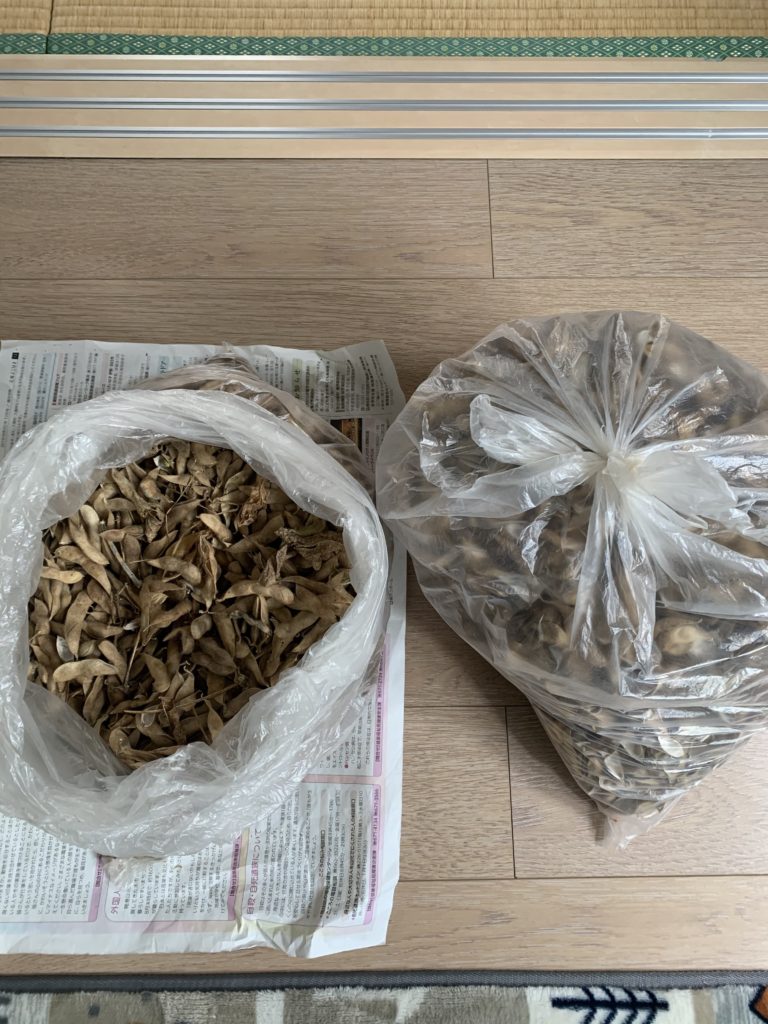 大豆の鞘ムキ キッズ農園 2021.01.08 (金) 未だ未だ大豆さんの鞘ムキ、こんなに沢山あります。 納豆や煮豆に良く使いましたが、未だこれだけ鞘が残っていて、部屋の中を、時折虫がモゾモゾ歩いてたり… こらーッ どこ行くっ〜 おとなしく袋の中に居なさ〜いッ