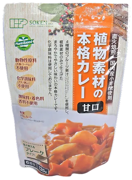 ○25種類以上のオリジナルブレンドスパイスと直火焙煎した国内産小麦粉などに4種類のフルーツ果汁(りんご・マンゴー・パイナップル・パパイヤ)を加え、植物性素材のみでコクのある、まろやかなやさしい味に仕上げたフレークタイプのカレールウです。(甘口)